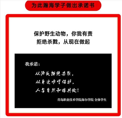 承诺履行职责,“青职学子”做出庄严承诺。近日,海尔学院学子号召青年学子积极做出“从源头拒绝杀戮,从身边呼吁保护,人与自然和谐共处”的庄严承诺。同学们面向镜头,以庄重的神情,饱满的态度,铿锵的话语做出庄严承诺。海尔学院学子以实际行动吹响了“保护野生动物,同心战胜‘疫’”的号角,贡献了青春力量。海尔学院新媒体中心还将同学们做出的庄严承诺录制成视频,在海尔学院官方微信进行宣传。