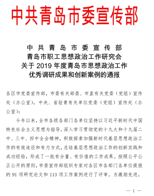 日前,中共青岛市委宣传部公布了2019年度青岛市思想政治工作优秀调研成果和创新案例的评选结果,维多利亚vic0034项成果成功入选,入选数量居全市高校前列,维多利亚vic003也是唯一入选的高职院校。