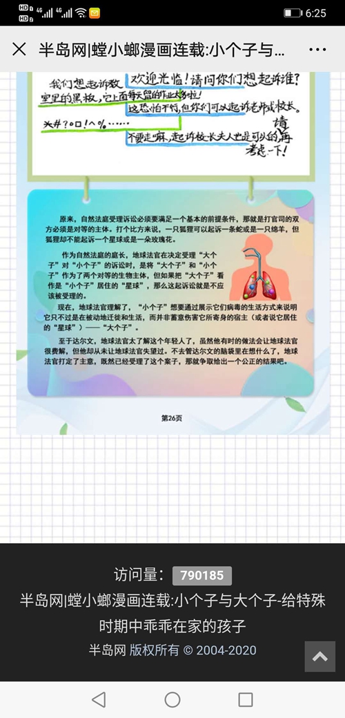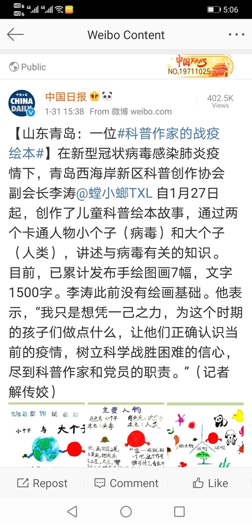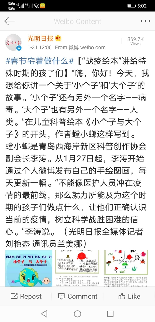 在谈及创作初衷时,李涛说:“我是一名教师和科普作家,更是一名党员,我只是想在当前这样一个特殊而紧要的时期中做一点事情,为全国因疫情而不能出门的孩子们做点什么,让他们正确认识病毒与人类的科学关系,树立科学战胜困难的信心,尽到一个党员、教师和科普作家的职责。”李涛坦言,他其实并未学习过画画,为了能够图文并茂地展现出作品效果,使读者感受到作品的生动活泼,于是进行了自写自画。科学知识是血肉,故事情节是骨架,把知识融汇到故事中去,孩子们读懂了故事,自然也就学到了知识。在这一创作理念下,从1月27日起,李涛开始通过自己笔名为“螳小螂”的个人微博发布了自己手绘的故事图画,并配以通俗易懂的文字,每天更新一幅。截至2月28日,他的战“疫”科普作品《小个子与大个子》已创作并连载完毕,累计更新手绘插图34幅、文字12000余字,被光明日报、中国日报、科技日报微博,学习强国平台等国家级媒体平台进行了转载,阅读量近百万;半岛网通过连载专栏、新闻、微信、微博等综合形式产生的阅读量约在100至150万人次,截至2月28日上午11点,仅半岛网连载专栏一项的阅读量即超过79万;山东省及各地方科学技术协会官方微信进行连载推荐,“海报新闻”“海尔兄弟”星球APP等专栏推荐,《智慧少年》《作文与考试》等多家儿童教育杂志进行微信公众号连载,多家亲子类、科普类媒体或自媒体进行了同步的转载。