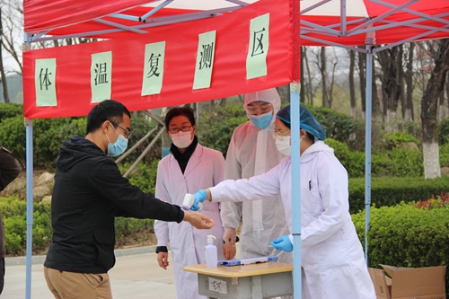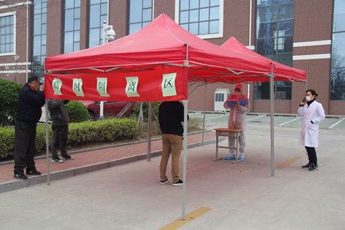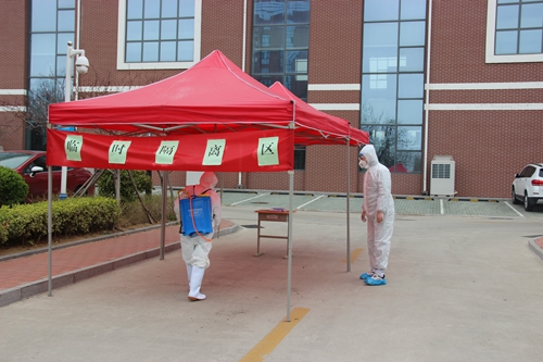 进入体温检测区,每位路过的“学生”都经过体温测量方可进入校园,针对进校后体温检测异常的学生,由现场工作人员迅速将其带至体温复检区进行体温复检,校医详细询问该生的流行病史信息,复检后仍显示异常人员,校医通过对讲机报告给指挥部,并将异常人员带离至临时隔离区等待120急救车的到来。同时随即对其经过的路线进行全面消毒。