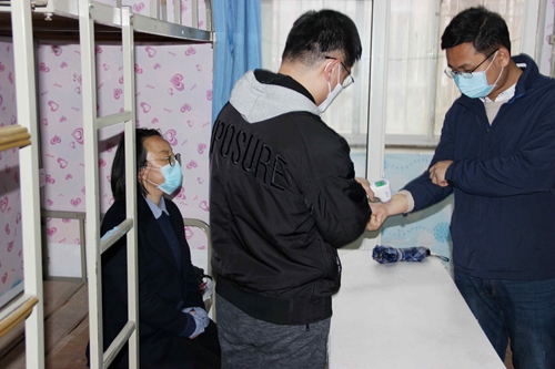 在学生宿舍,模拟返校后学生在宿舍出现发热症状。学生在每日体温自测时发现体温异常,立即拨打校医院电话,并拨打辅导员电话上报学校。120急救车来到园区,接走学生送往医院就诊,同宿舍同学及该生的密切接触者立即被送往学校隔离区进行隔离。消毒人员对该生所在宿舍立即进行现场消杀。