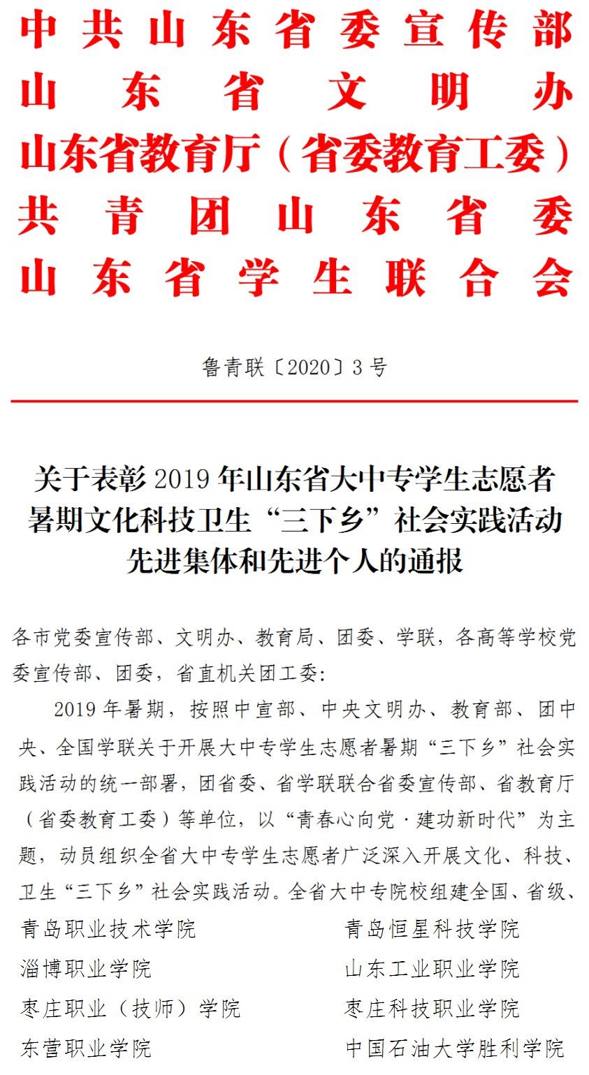 近日,中共山东省委宣传部、省文明办、省教育厅、山东团省委、省学生联合会发布2019年山东省大中专学生志愿者暑期文化科技卫生“三下乡”社会实践活动通报,对在2019年“三下乡”社会实践活动中表现优秀,成绩突出的单位、团队和个人进行了表彰。学校团委连续三年荣获山东省大中专学生志愿者暑期“三下乡”社会实践活动优秀组织单位称号,12名学生、7名优秀指导教师以及5支团队分别获得2019年山东省大中专学生志愿者暑期“三下乡”社会实践“优秀学生”“优秀指导教师”和“优秀服务队”等荣誉称号。