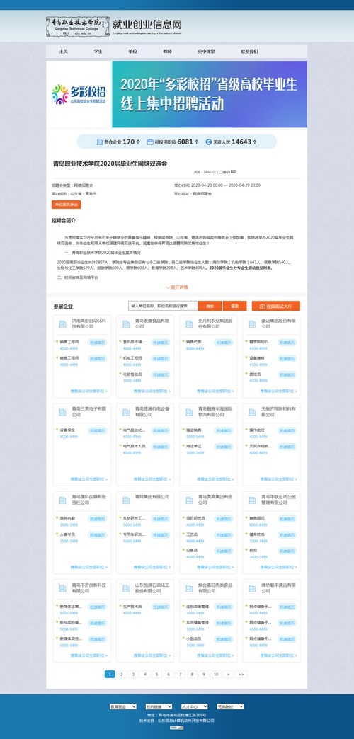 网络招聘会基于学校就业创业信息网和微信公众号平台,采用“单位报名+线上双选+视频面试”的形式,共有170家企业参加,与学校深度校企合作的青啤集团、海尔集团、青岛海湾集团、万华化学集团、特锐德、青岛酷特智能、上汽通用五菱等行业领军企业纷纷参与并发布优质岗位信息。此次招聘会主要涉及制造业,信息传输、软件和信息技术服务业、批发和零售业等15个行业,共提供职位478个,就业岗位6081个,累计14607人次关注并参与。