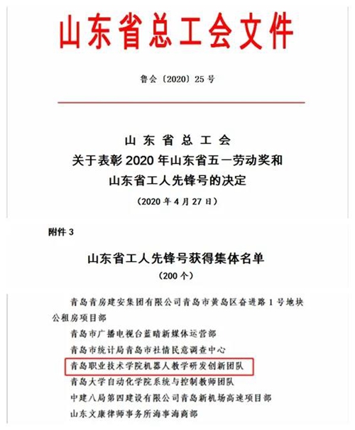 在“五一”国际劳动节到来之际,山东省总工会发布《关于表彰2020年山东省五一劳动奖和山东省工人先锋号的决定》(鲁会〔2020〕25号),对在经济、政治、文化、社会、生态文明、党的建设中和疫情防控一线涌现的先进集体和先进个人进行了表彰,共授予350名职工山东省五一劳动奖章,100个集体山东省五一劳动奖状,200个集体山东省工人先锋号。青岛教育系统7个集体和个人获省五一劳动奖状(章)和省工人先锋号。其中维多利亚vic003机器人教学研发创新团队获得山东省工人先锋号,海尔学院(机电学院)教师李元超获得山东省五一劳动奖章。
