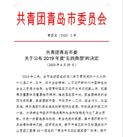 近日,共青团青岛市委发文,表彰2019年度在全省、全市共青团工作中涌现出的先进典型,激励广大团员、团干部和各级团组织奋发有为、再立新功。
