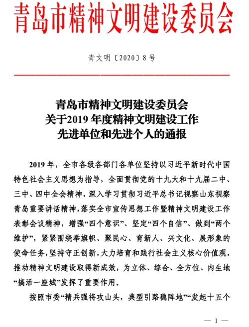 7月13日,青岛市精神文明建设委员会发布《关于2019年度精神文明建设工作先进单位和先进个人的通报》(青文明〔2020〕8号),对在2019年度全市精神文明建设领域表现突出的260个单位和490名同志予以通报表扬。学校荣获“2019年度精神文明建设工作先进单位”荣誉称号;学校党委宣传部部长、文明办主任田秀丽荣获“2019年度精神文明建设工作先进个人”荣誉称号。