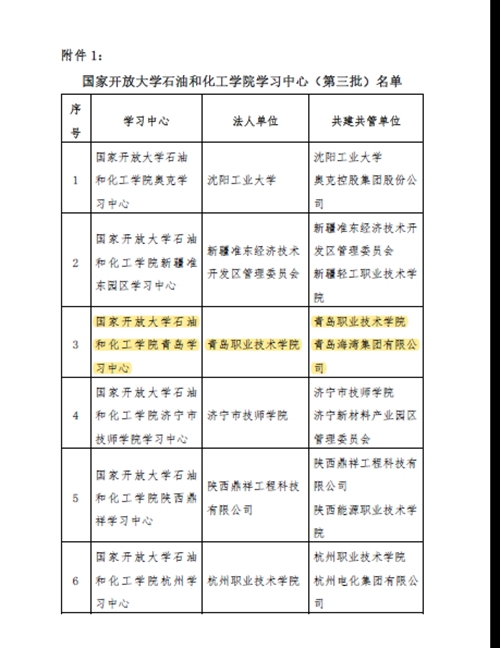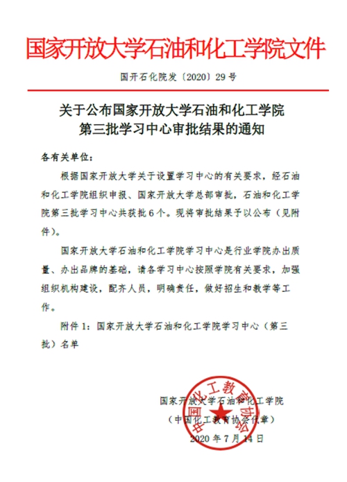 国家开放大学石油和化工学院学习中心(第三批)名单