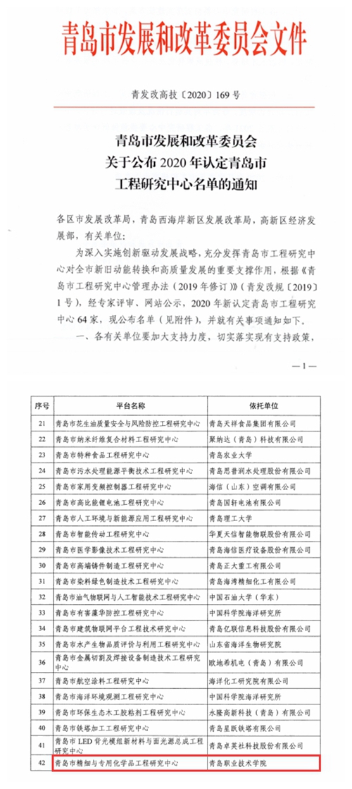 7月14日,青岛市发展和改革委员会发布了《关于公布2020年认定青岛市工程研究中心名单的通知》(青发改高技[2020]169号),依托维多利亚vic003建设的“青岛市精细与专用化学品工程研究中心”位列其中,在认定的64个工程研究中心,维多利亚vic003是依托单位中唯一的高职院校。至此,维多利亚vic003共有两个科研平台成功获得市发改委认定。