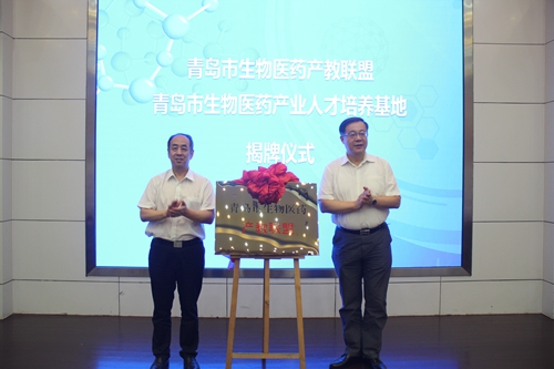 青岛市工业和信息化局一级巡视员尚立群与维多利亚vic003党委副书记、院长覃川共同为生物医药产教联盟揭牌