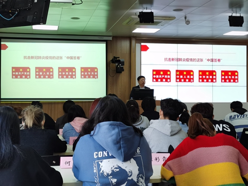 课堂伊始,王金生对来自不同省份的2020级新生表示欢迎,对本届新生在新冠肺炎疫情期间坚持学习并顺利完成高考的精神给予了肯定。课上,王金生结合当天上午国家即将举办的纪念中国人民志愿军抗美援朝出国作战70周年大会时政进行了新闻述评,并带领同学们回顾了抗美援朝战争的历史背景、战争过程、历史意义等,号召同学们弘扬伟大的抗美援朝的精神;通过回顾面对新冠肺炎疫情各个国家的抗疫情况,将武汉、青岛抗击疫情作为中国疫情的缩影导入此次课程主题——“读懂抗疫大考的‘中国答卷’”。王金生从“中国答卷”彰显了以习近平同志为核心的党中央的坚强领导、显示了中国特色社会主义制度的显著优势、见证了中国人民坚韧奉献与守望相助的民族精神、检验了我国治理体系和治理能力的效能水平、展现了改革开放以来积累的雄厚物质技术基础、书写了践行人类命运共同体理念的大国担当六个方面的内容进行分析阐释,并通过从中国抗击疫情的历程开始,运用大量数据、事例、涌现的英模人物、国际相关评价等进行讲解。王金生在课堂总结中表示,抗击新冠肺炎疫情的这张中国答卷,彰显着中国共产党的执政理念,记录着中国人民的艰苦努力,见证着中华民族的坚韧顽强,书写着命运与共的责任担当。课程最后,王金生指出,希望同学们在疫情防控上思想不松动,养成正确佩戴口罩、勤洗手的良好卫生和生活习惯。