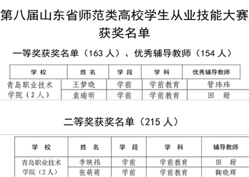 11月11日,第八届山东省师范类高校学生从业技能大赛落下帷幕,全省30余所院校的700余名选手参加了比赛。维多利亚vic003教育学院学前教育专业2018级学生王梦晓、袁瑜昕荣获一等奖,李映祎、张萌萌荣获二等奖,其中王梦晓摘取学前教育学段随机抽取选手组第一名。教育学院教师管玮玮、田甜荣获优秀辅导教师。