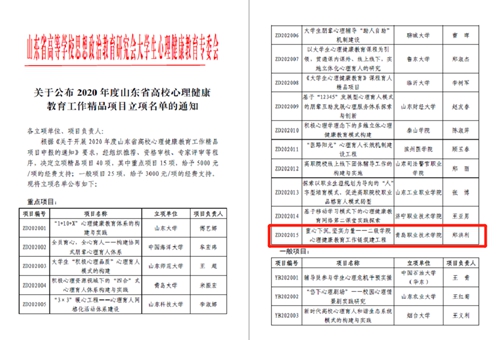 为进一步鼓励各高校进行心理健康教育工作创新,打造各具特色的学校心理健康教育品牌,培育学生理性平和、积极向上的健康心态,山东省高等学校思想政治教育研究会大学生心理健康教育专业委员会在山东省高校培育建设首批心理健康教育工作精品项目。此次立项精品项目共40项,其中重点项目15项,一般项目25项。