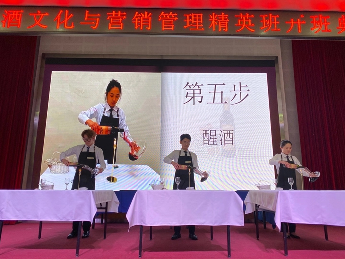 揭牌仪式结束后,首届“葡萄酒文化与营销管理”精英班的学生代表进行了精彩的葡萄酒与侍酒服务技能展示,CAFA中国山东教学组的教师为学生们带来了精英班开班第一课——《葡萄酒简史》。