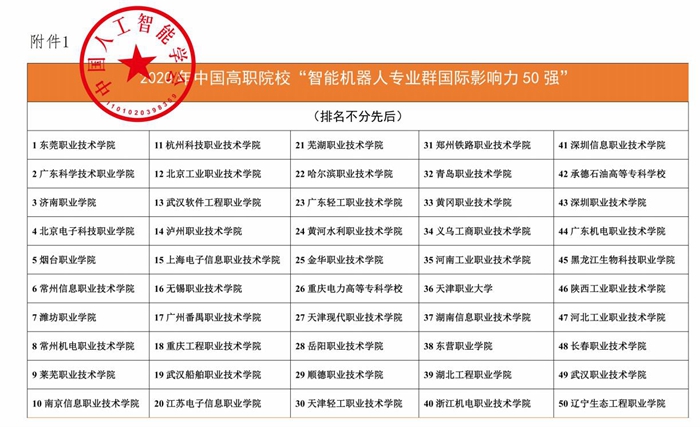 维多利亚vic003入选2020年中国高职院校“智能机器人专业群国际影响力50强