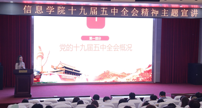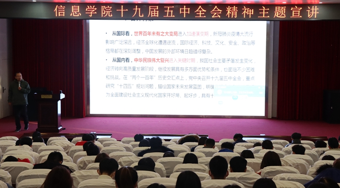 此次系列宣讲会围绕习近平总书记在党的十九届五中全会上的重要讲话精神,全面介绍了党的十九届五中全会召开的历史背景、“十四五”规划《建议》起草过程和重要特征,从深刻认识我国进入新发展阶段的重大意义,准确把握2035年远景目标和“十四五”时期经济社会发展的指导思想和必须遵循的原则、目标任务和重大举措等方面,对党的十九届五中全会精神进行了全面宣讲和深入解读,号召同学们树立远大志向,不负韶华,为全面建设社会主义现代化国家而发奋学习、努力奋斗。