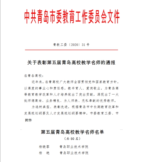 据悉,青岛高校教学名师评选每两年举办一次,已举办五届,是中共青岛市委教育工委、青岛市教育局根据青岛市中长期教育改革和发展规划纲要及人才发展规划纲要精神,在青岛高等教育教学改革和人才培养工作中做出突出贡献、师德高尚、业务精良、为人师表、无私奉献的优秀教师中进行选拔和表彰的一项人才工程。