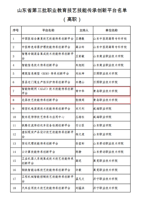 山东省第三批职业教育技艺技能传承创新平台名单