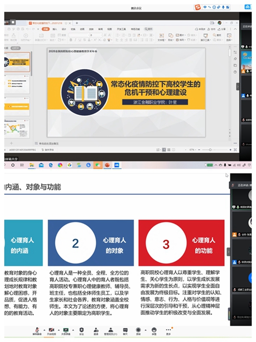 活动当日下午,年会开设的4个分会场分别以“后疫情时代高职院校心理健康教育工作新特点、新变化、创新点”“危机干预过程中的新问题”“高职院校心理健康教育课程”以及“高职学生心理健康及心理育人”4个主题开展了专题研讨。