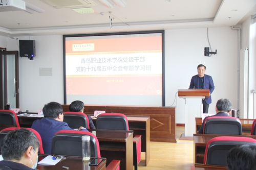 为深入学习贯彻党的十九届五中全会精神,根据中央部署和省委、市委要求,1月13日至15日,学校举办了党的十九届五中全会精神处级干部专题学习班。党委书记王金生作《坚定信心,对标对表,以新作为开启现代化建设新征程》专题报告。校领导刘甲珉、薛玉平、刘伟、邢广陆、齐顾涛出席专题报告会。学校处级以上干部参加了专题学习班学习。