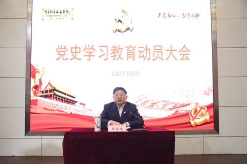 3月5日上午,学校在报告厅召开党史学习教育动员大会。校党委书记王金生出席会议并讲话,校领导薛玉平、邢广陆、齐顾涛,处级干部、党支部书记共100余人参加了会议。校党委副书记刘甲珉主持会议。