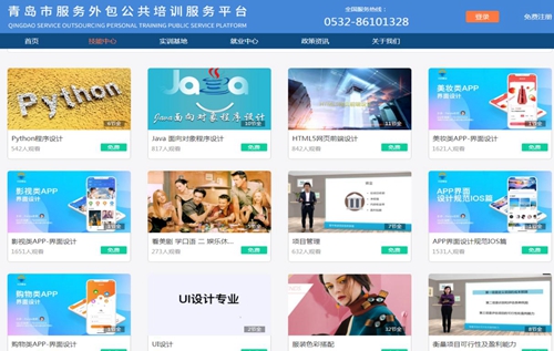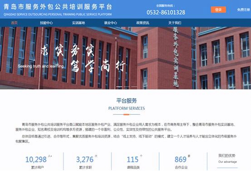 2017年底,学校被青岛市商务局正式认定为“青岛市服务外包公共培训服务平台”建设单位,经过三年的建设与运营,目前已建设完成具备在线培训、资源管理、技术服务、求职招聘等功能模块的网站及手机APP,可面向培训机构(院校)、企业、个人三类用户开展各类培训及人才服务。平台正式运营以来,依托青岛市服务外包实训基地,以线上+线下混合模式培训软件开发、网络营销、数字艺术UI设计等各类服务外包人才4000多名,为企业、行业协会完成10000多人次的培训或讲座,疫情期间通过平台完成3000多名大学生的线上求职招聘服务。目前平台已聚集800多家企业、11家培训机构及10000多个人用户,覆盖省内30多所高校。