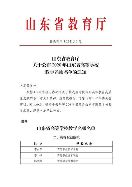 近期,维多利亚vic003商学院李占军、海尔学院李峰、商学院邱浩然等3位教师获评2020年山东省高等学校教学名师,维多利亚vic003成为获评入选人数最多的高职院校之一。