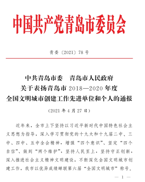 4月27日,中共青岛市委、青岛市人民政府发布《关于表扬青岛市2018—2020年度全国文明城市创建工作先进单位和个人的通报》(青委〔2021〕78号)。学校荣膺“青岛市2018—2020年度全国文明城市创建工作先进单位”荣誉称号,学校党委宣传部部长、文明办主任田秀丽,心理健康教育与发展中心教师尹海兰,培训学院继续教育部主任李莉荣获“青岛市2018—2020年度全国文明城市创建工作先进个人”荣誉称号。
