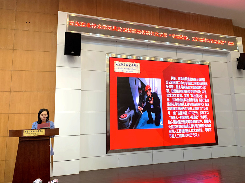 5月8日上午,全国劳动模范、青岛地铁集团有限公司车辆部工程车检修技师尹星受聘为学校思政课特聘教授,并为师生作劳模精神专题讲座。副院长邢广陆出席活动。来自马克思主义学院、生物与化工学院、海尔学院等近200名师生参加活动。