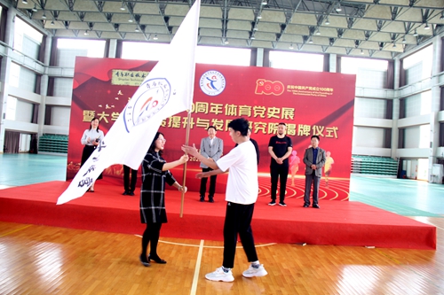 仪式上,王金生、陈建华、陈玉鑫共同为大学生体质提升与发展研究院的成立揭牌。邢广陆、张辉分别代表校企双方致辞。邢广陆为大学生体质提升训练营的学员代表授营旗,并鼓励训练营的学员们刻苦努力训练争取体质测试顺利通过。