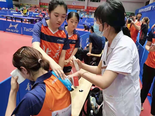 医疗志愿者正在给运动员做紧急处理
