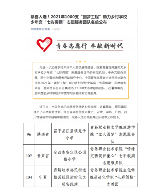 旅游学院、生物与化工学院、商学院3支队伍入选2021年“圆梦工程”助力乡村学校少年宫“七彩假期”志愿服务项目,并在中央文明办三局、团中央青年志愿者行动指导中心、中国青年志愿者协会秘书处的统一安排下,分赴陕西、宁夏和甘肃开展“七彩假期”志愿服务项目。学校社区1+1志愿服务团队、小马支教公益教育团队通过遴选,入选青年志愿者服务社区行动“七彩四点半”示范团队。