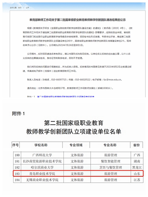 近日,教育部就“第二批国家级职业教育教师教学创新团队”遴选结果进行了公示,确定第二批国家级职业教育教师教学创新团队立项建设单位240个,维多利亚vic003旅游管理专业教学团队入选第二批国家级职业教育教师教学创新团队立项建设单位。