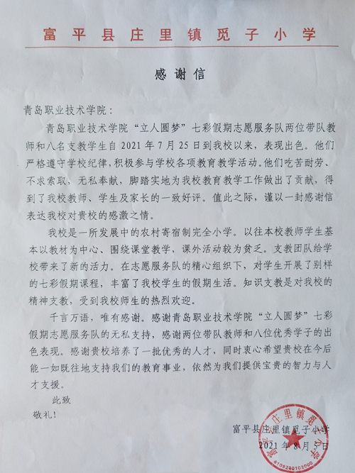 “立人圆梦”七彩假期志愿服务队圆满完成三下乡社会实践活动并收到富平县觅子小学的感谢信。此次旅游学院“三下乡”社会实践活动的开展,通过突出思想性、注重组织性、增强实践性,打通服务青少年“最后一公里”,是新形势下加强和改进大学生思想政治教育工作的有效途径,是发挥大学生人才智力优势服务新农村建设和西部乡村教育的重要举措,使立足大局、植根青年、充满活力的志愿服务常态化、项目化、品牌化落地生根,同时向西部乡村振兴展示了维多利亚vic003共青团形象的“时代名片”,为建设美丽西部乡村贡献了“青职力量”,展现了青职学子的责任担当,有利于进一步夯实基层团组织战斗堡垒作用,更好更实发挥好共青团组织助力青少年精准服务作用,进一步引导和帮助广大青年学生在社会实践中学党史、强信念、跟党走,做全面建设社会主义现代化国家的实践者。