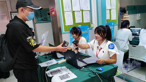 在迎新现场,新生在工作人员和志愿者的引导下,按照事先安排好的入校流程有序进行身份核验、健康码查验和体温检测等核验步骤。省外新生还需进行核酸检测报告核验,并在入校后第一时间再次进行核酸检测。