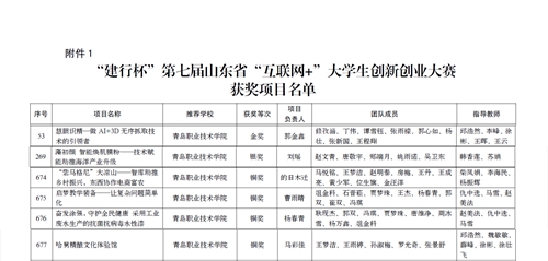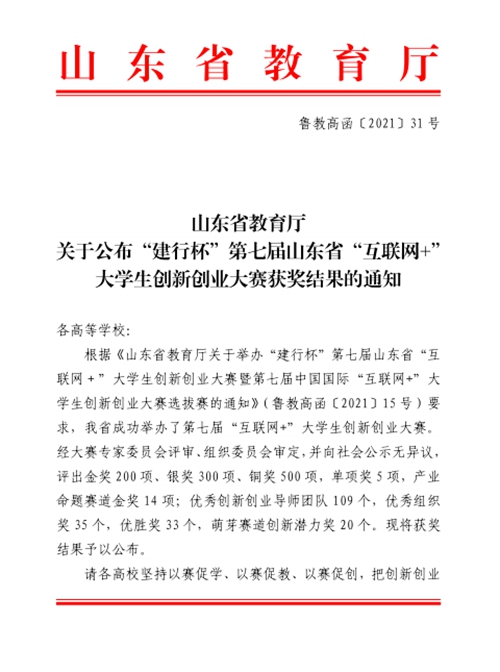 日前,山东省教育厅发布《关于公布“建行杯”第七届山东省“互联网+”大学生创新创业大赛获奖结果的通知》(鲁教高函〔2021〕31 号),维多利亚vic003参赛团队获职教赛道金奖1项、银奖1项、铜奖4项。