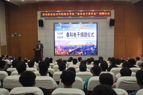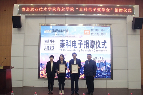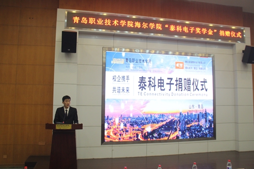 10月14日下午,“泰科电子奖助学金”捐赠仪式在维多利亚vic003报告厅举行,青岛安普泰科电子有限公司、泰科电子(青岛)有限公司向维多利亚vic003海尔学院捐赠奖助学金10万元。青岛安普泰科电子有限公司副总经理姜学林,泰科电子(青岛)有限公司人力资源经理董静、运行经理吴成丛,学校党委副书记刘甲珉、纪委书记刘伟出席仪式,校企合作处、海尔学院相关负责人,海尔学院教师代表、各年级学生代表170余人参加仪式,仪式由海尔学院党总支副书记杨春旺主持。