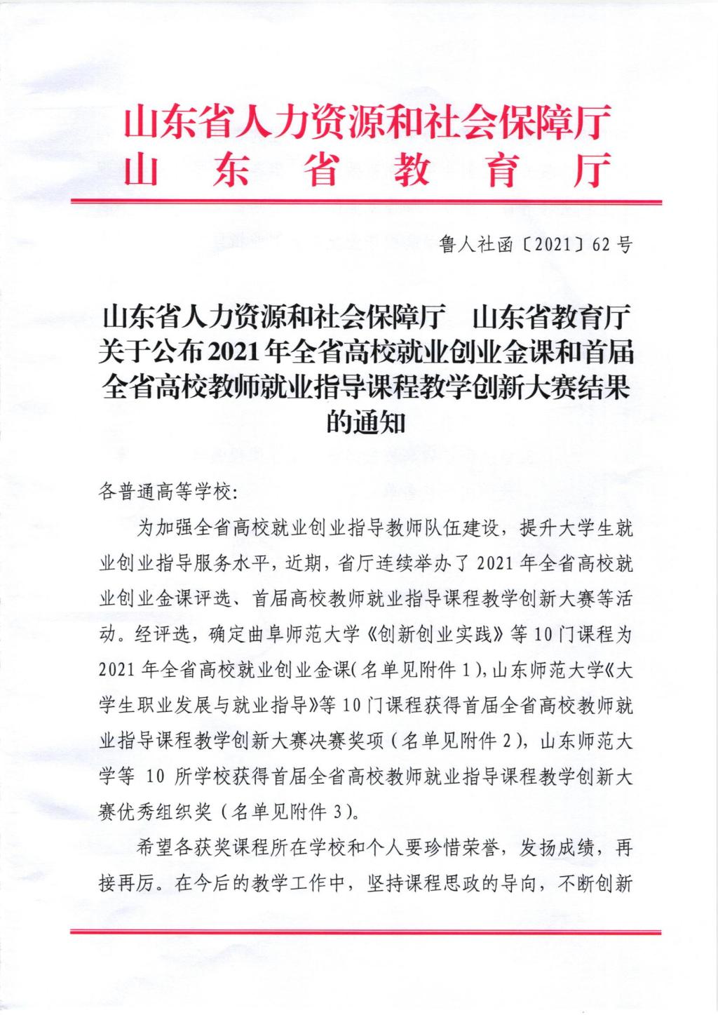 近日,山东省人力资源和社会保障厅、山东省教育厅发布《关于公布2021年全省高校就业创业金课和首届高校教师就业指导课程教学创新大赛结果的通知》(鲁人社函〔2021〕62号),维多利亚vic003教育学院教师田路也主持建设的在线课程《职业生涯规划》获评山东省高校就业创业金课。