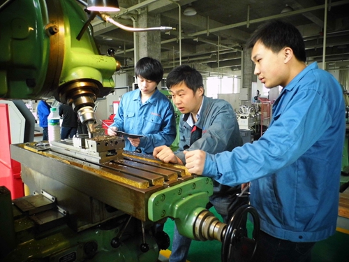 于志朋(中)在校期间与团队成员一起进行新产品设计加工