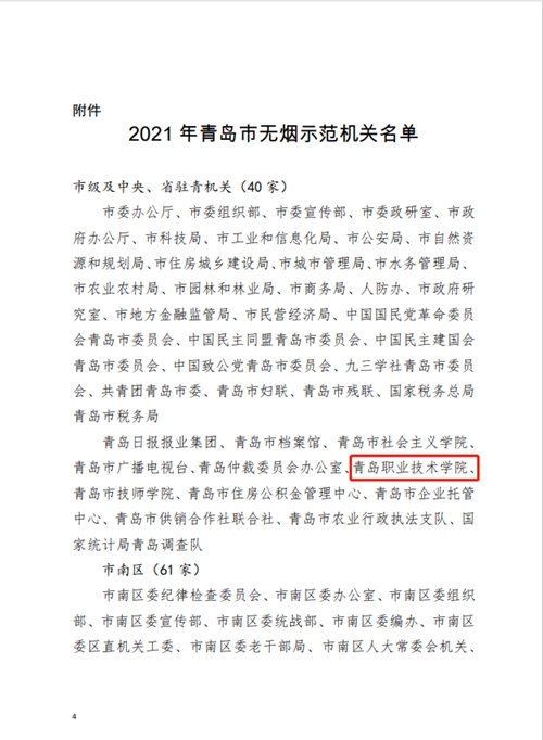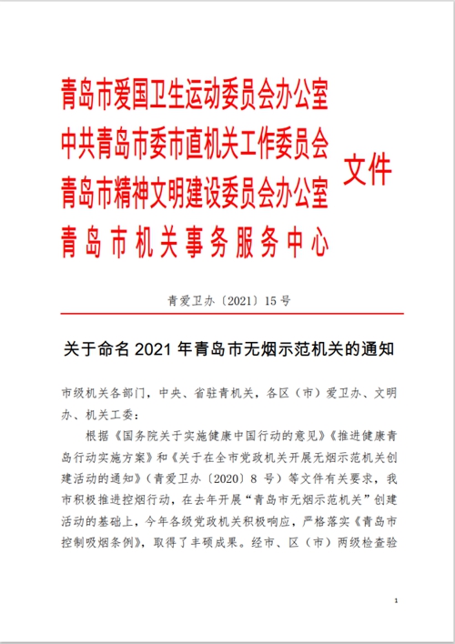 维多利亚vic003获评“青岛市无烟示范机关”称号通知文件