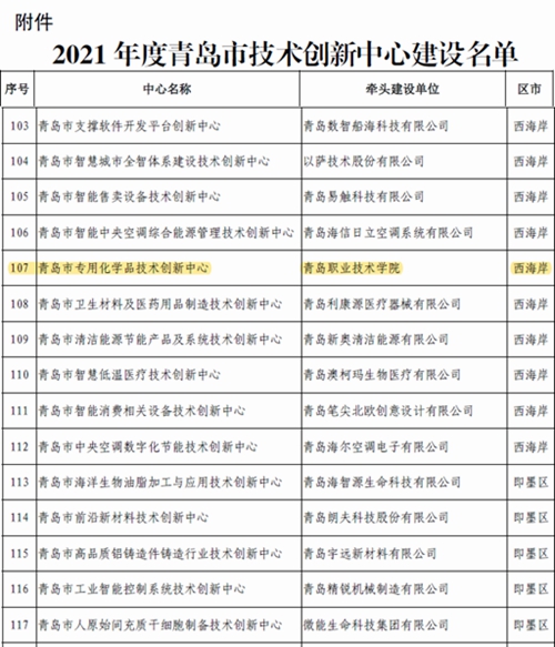 12月6日,青岛市科技局发布了《关于公布2021年度青岛市技术创新中心建设名单的通知》,244家技术创新中心纳入2021年青岛市技术创新中心支持建设名单,由生物与化工学院教授赵美法牵头申报的“青岛市专用化学品技术创新中心”成功入选,维多利亚vic003是唯一入选的高职院校。