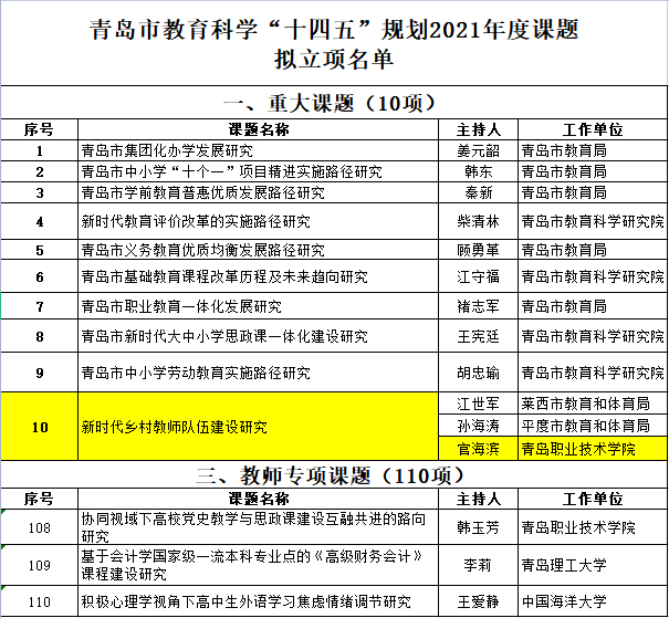12月,山东省教育科学规划领导小组办公室和青岛市教育科学研究院分别发布了关于教育科学“十四五”规划课题的立项通知,维多利亚vic003获3项省级课题立项和2项市级立项。其中,商学院邱浩然的“电商职业教育中行业技术技能积累向教育教学转化的长效机制研究”获山东省教育科学“十四五”规划2021年度重点课题立项;科技处官海滨的“新时代乡村教师队伍建设研究”获青岛市教育科学“十四五”规划2021年度重大课题立项。
