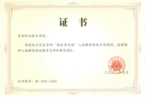 2021年5月28日,维多利亚vic003推荐的《高品质沟通》课程被确定为国家级继续教育课程思政示范课程,旅游学院教授赵迁远被认定为国家级课程思政教学名师。此次为教育部评选的首批课程思政示范课程,其中继续教育类共评出100门示范课程,维多利亚vic003为山东省唯一入选职业院校。《管理学基础》等4门课程被评为山东省课程思政示范课程。2021年,学校积极推进“思政课程”与“课程思政”协同育人新格局,印发思政课程和课程思政工作改革实施意见,积极推进思政课程与课程思政教育教学改革。学校被授予“青岛市新时代大中小学思政课一体化建设联盟学校”。教师获首届全省学校思政课教学设计大赛特等奖、“萌新磨课会”总会特等奖等,思政课程与课程思政改革涌现新成果,形成了“人人讲育人、门门有思政”的协同育人新格局。