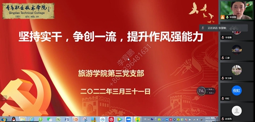 3月31日,全国党建工作样板支部培育创建单位旅游学院第三党支部举办“坚持实干,争创一流,提升作风强能力”主题党日活动。活动由支部书记张慧敏主持,采用腾讯会议方式进行,分为集中学习与专题讨论两部分。