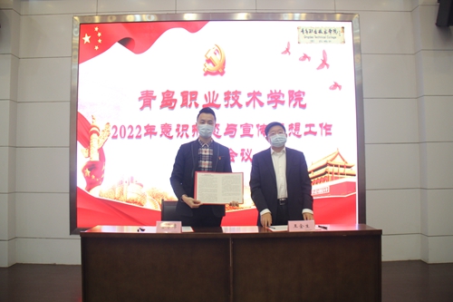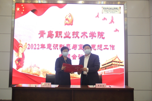 会上,党委书记王金生分别与党总支、职能部门负责人代表签订了意识形态工作责任书。马克思主义学院副院长郑萍萍、学生工作部部长韩煜、大学生心理健康教育中心副主任尹海兰、旅游学院党总支副书记王媛媛分别作交流发言,从思想政治理论课建设和教学改革、学生思想政治教育、心理健康教育、宣传和文化建设等方面介绍了所在部门开展意识形态与宣传思想工作的典型经验和体会。