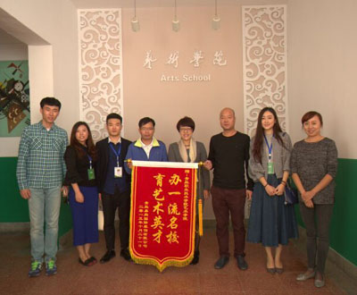 10月26日,青岛易尚国际装饰公司总经理及人事部经理来到艺术学院,赠送“办一流名校 育艺术英才”锦旗以表感谢,艺术学院院长乔璐、副院长刘卫国代表学院接受了锦旗。