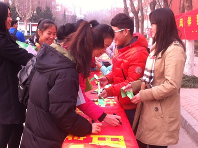 期末考试将至,为营造一个良好和谐的考试氛围,12月30日上午,商学院团总支在海韵厅旁举办了“手系绿丝带之优良考风伴我行”宣传活动。 此次手系绿丝带活动,就树立诚信考风,营造和谐校风做了大量宣传工作。虽天气寒冷,但同学们积极参与,热情响应。这一条条绿丝带系着的不仅仅是同学们一只只手腕,更是对诚信考风、优良学风、和谐校风的传承。 活动不仅有利于提高了广大同学对考试作弊严重性的认识,也加强了对同学们的诚信教育,为营造良好的公平竞争环境打下基础。