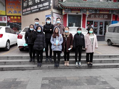 志愿者向市民发放防霾口罩防治雾霾志愿者小分队同学合影