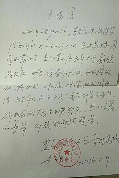 老年大学发来的表扬信