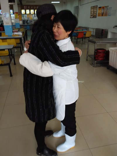 学生逄婉茹激动的与保洁员刘安贞拥抱