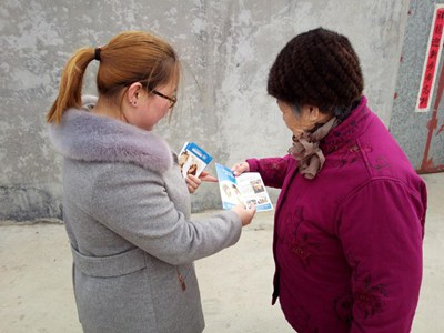 志愿者在向老奶奶宣传灵珠山社工中心的活动